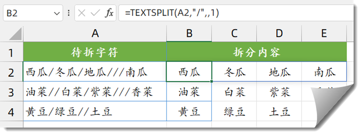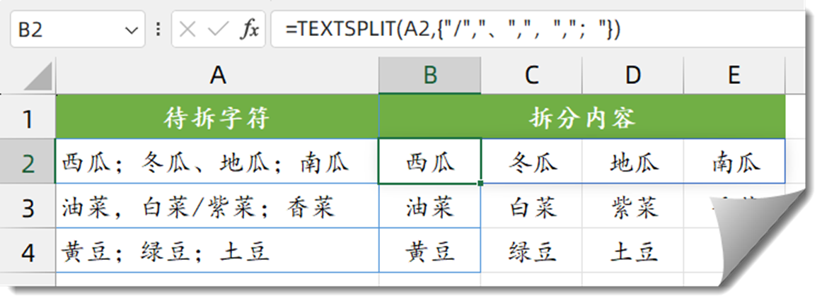 TEXTSPLIT将依次按花括号中不同类型的分隔符拆分到各列。