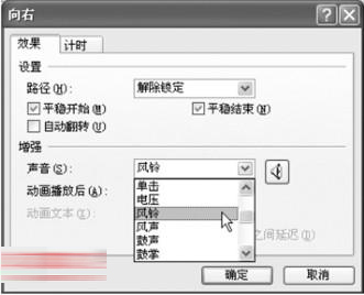 第2步,在“声音”中选择一种声音效果,如“风铃”,如图8所示,单击“确定”按钮即可。