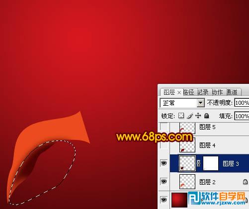 <图22> 21、新建一个图层,用钢笔勾出下图所示的选区,羽化3个像素后填充红色。